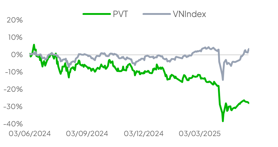 Bước sang 2025, PVT đặt kế hoạch kinh doanh tương đối thận trọng, dự phóng doanh thu 10,300 tỷ đồng (-16.3% svck) và LNST-CĐTS 960 tỷ đồng (-12.2% svck). Sự dè dặt này chủ yếu đến từ lo ngại các mức thuế nhập khẩu mới của Mỹ có thể làm giảm sản lượng hàng hóa trên các tuyến đường dài, khiến tăng trưởng ton-miles chững lại trong giai đoạn đầu năm.