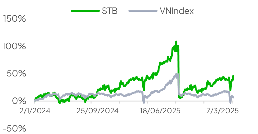 Sau gần một thập kỷ nằm trong chương trình tái cơ cấu của Ngân hàng Nhà nước, ngân hàng đang tiến gần đến việc hoàn tất thu hồi các khoản nợ xấu tồn đọng này để sẵn sàng cho một chu kỳ tăng trưởng mới. Nhìn về phía trước, STB có vị thế tốt để đạt tốc độ tăng trưởng tín dụng mạnh mẽ với CAGR 16% giai đoạn 2025–2028, cùng với sự cải thiện về hiệu quả vận hành.