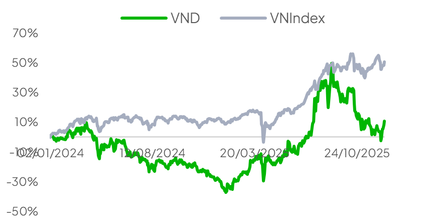- Định giá chiết khấu sau giai đoạn tái cấu trúc và vượt qua biến động lớn. Giai đoạn 2022–2024 đánh dấu nhiều khó khăn đối với VND khi công ty chịu áp lực lớn từ khoản cho vay Trung Nam và sự cố an ninh mạng. Tuy nhiên, phần lớn rủi ro đã được phản ánh vào giá cổ phiếu và từng bước được xử lý thông qua trích lập dự phòng và nâng cấp hệ thống quản trị công nghệ. VND hiện giao dịch ở mức P/E 2025F khoảng 15.2x và P/B khoảng 1.4x – thấp hơn đáng kể so với ngành ở mức 19.8x P/E và 2.3x P/B. Trong bối cảnh thị trường bước vào chu kỳ phục hồi và thanh khoản cải thiện, chúng tôi kỳ vọng định giá của VND sẽ được tái đánh giá tích cực, nhờ sự cải thiện của hoạt động kinh doanh cốt lõi và năng lực vận hành ngày càng vững chắc.