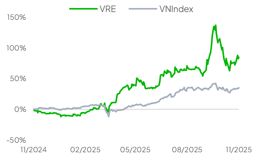 Trước đây, VRE là công ty con của Tập đoàn Vingroup (VIC). Năm 2024, VIC đã thoái toàn bộ vốn tại SDI – pháp nhân sở hữu 99,9% CTCP SADO Trading, đơn vị nắm giữ trực tiếp 41,5% cổ phần VRE. Sau giao dịch này, tỷ lệ sở hữu trực tiếp của VIC tại VRE giảm xuống 18,8%. Dù vậy, VRE vẫn tiếp tục hưởng lợi từ hệ sinh thái Vingroup, đặc biệt là Vinhomes, thông qua việc tiếp cận quỹ đất chất lượng cao và tệp khách hàng tích hợp.